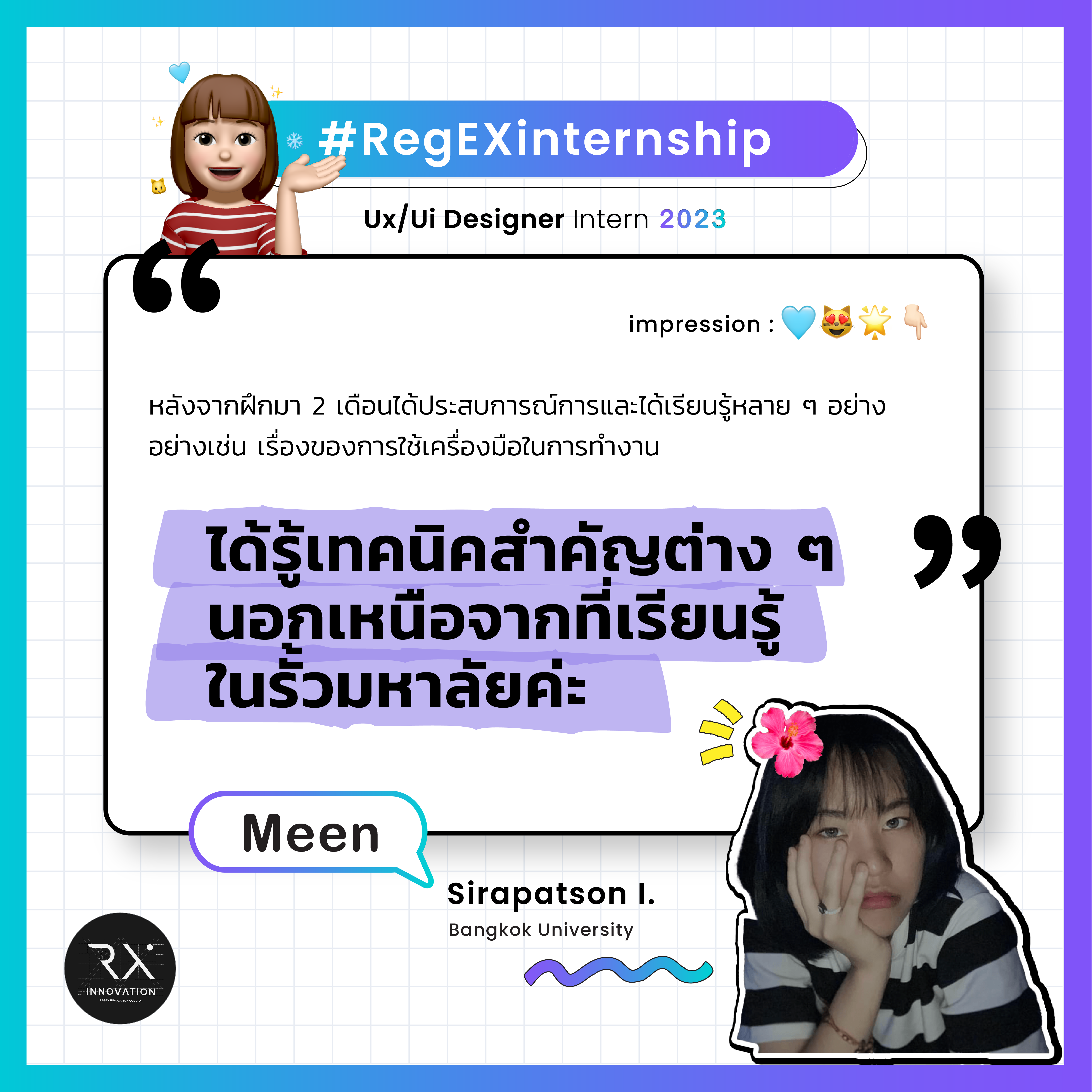 มีเพื่อนแนะนำมาให้รู้จักกับบริษัทนี้ ก่อนที่จะตัดสินใจเลือกที่นี่ก็ได้มีการแอบไปส่องเพจใน facebook และรู้สึกว่า Regex เป็นบริษัท start up ที่น่าสนใจ ดูมีความเป็นกันเอง และพี่ ๆ ก็ดูใจดีมากค่ะ